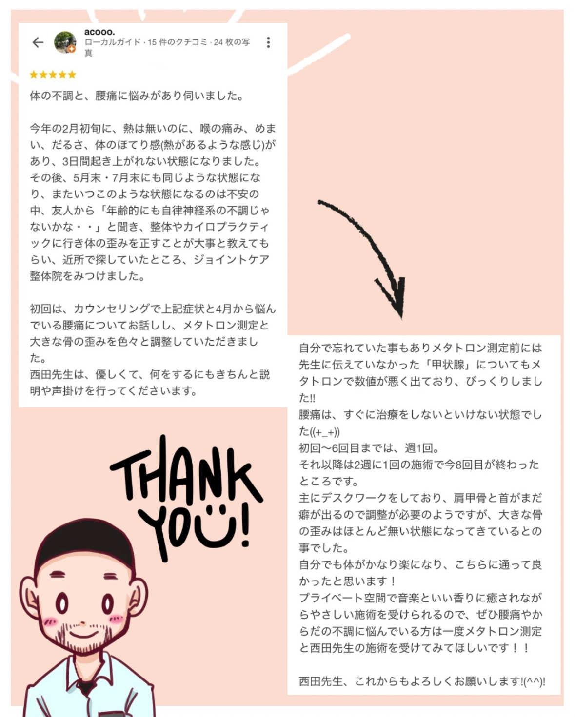その後、5月末・7月末にも同じような状態になり、またいつこのような状態になるのは不安の中、友人から「年齢的にも自律神経系の不調じゃないかな・・」と聞き、整体やカイロプラクティックに行き体の歪みを正すことが大事と教えてもらい、近所で探していたところ、ジョイントケア整体院をみつけました。