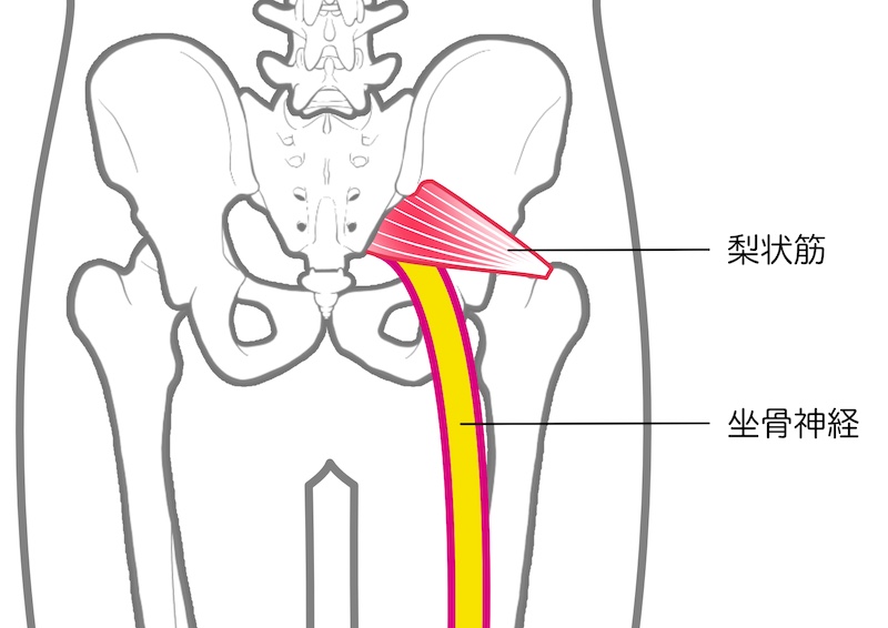 特に梨状筋が坐骨神経を圧迫することで脚の痺れや痛み、腰痛が起こる「梨状筋症候群」が有名。